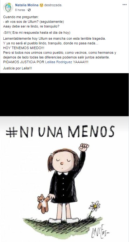 “Cuando me preguntan: – ah vos sos de Ullum? (seguidamente) Aaay debe ser re lindo, re tranquilo? -Si!!!( Era mi respuesta hasta el dia de hoy) Lamentablemente hoy Ullum se mancha con esta terrible tragedia. Y ya no será el pueblo lindo, tranquilo, donde no pasa nada… HOY TENEMOS MIEDO!!!”, escribió la mujer en su cuenta de Facebook.