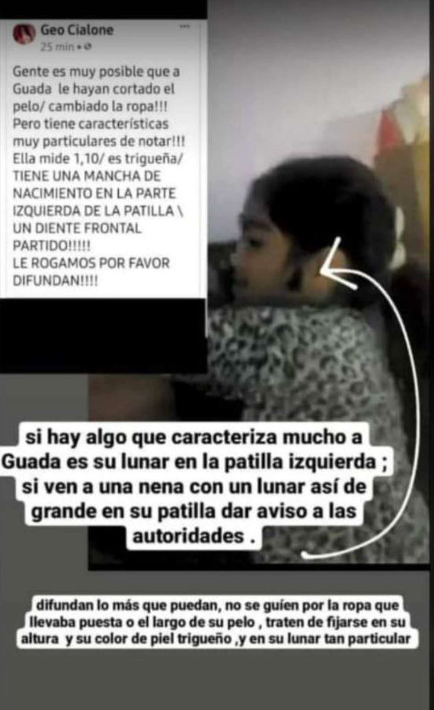 La vendedora hizo una exposición en la Seccional N°42, en la que relató que el jueves habría atendido el jueves a un hombre y una nena, que compraron un par de zapatillas para la menor. La mujer, luego de observar la imagen de Guadalupe en televisión, notó ciertas similitudes con la chica que estuvo en su local.