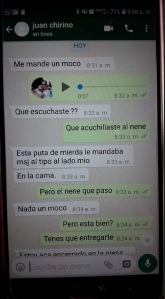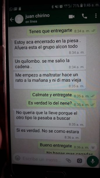 El interlocutor le pidió que se entregara pero el asesino siguió con su relato. "Afuera está el Grupo Halcón", le dijo Chirino y se justificó: "Un kilombo, se me salió la cadena. Me empezó a maltratar hace un rato a la mañana y no di más, vieja”.