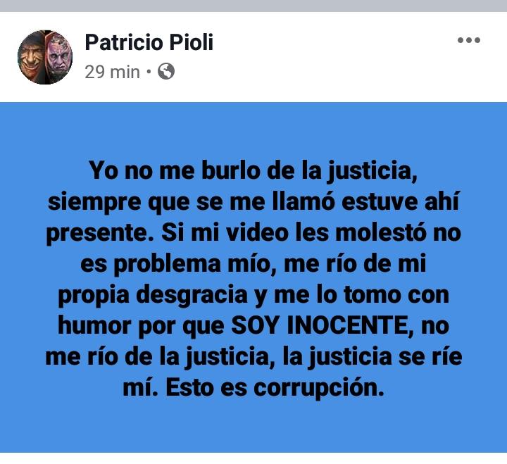 "Yo no me burlo de la Justicia, siempre que se me llamó estuve ahí presente. Si mi video les molestó no es problema mío", expresó Pioli, y aclaró que "me río de mi propia desgracia y me lo tomo con humor por que soy inocente, no me río de la Justicia, la Justicia se ríe mí. Esto es corrupción".