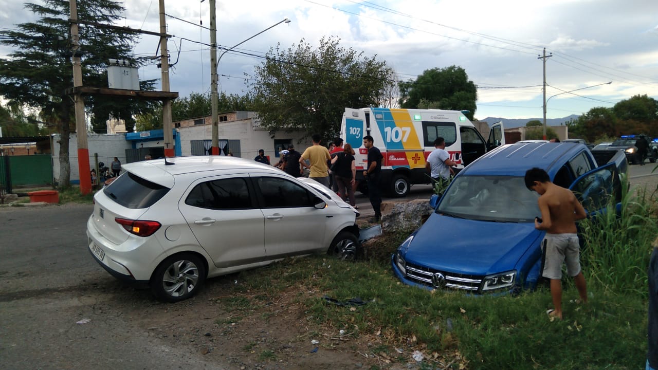 Este miércoles en la tarde, alrededor de las 19, dos vehículos protagonizaron un aparatoso choque en el cruce de calles Oro y Necochea, en El Mogote, Chimbas. Uno de ellos terminó de punta en un zanjón mientras que el de menor porte quedó encima de un sifón de canal.