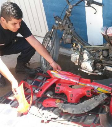 Los policías de la Subcomisaría del B° Cipolletti de Chimbas allanaron ayer una casa del B° Martín Fierro y sorprendieron a un adolescente de 16 años desarmando una moto Maverick 110 que había sido robada a una mujer el sábado último. El menor fue llevado detenido, pero a las horas un juez lo entregó a sus padres.