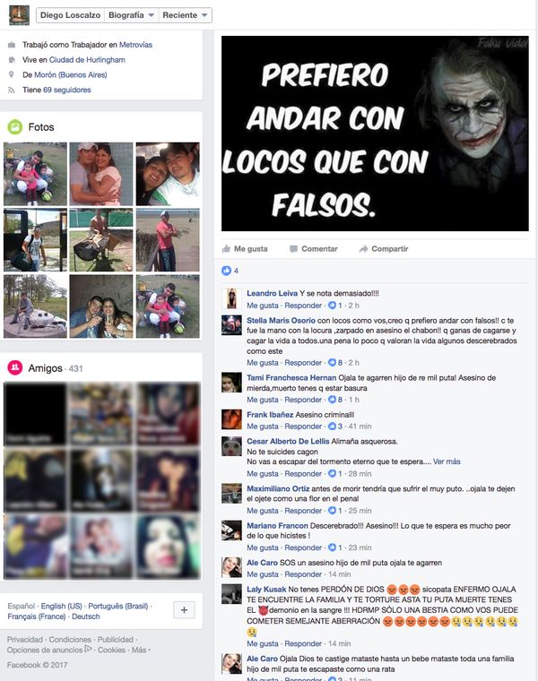 La reacción popular es contundente: en su muro se puede leer una catarata de mensajes cargados de ira contra su persona que se replican sin cesar. Ni siquiera la imagen de la virgen que usa como foto de perfil generó algún sentimiento de compasión. Mientras tanto, la policía lo busca intensamente.