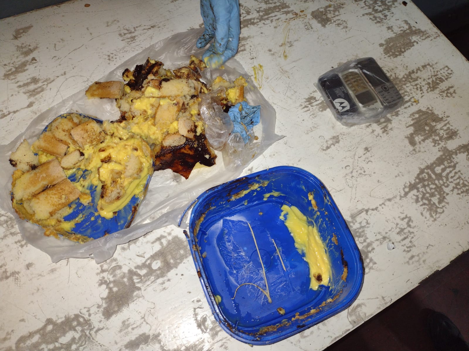 Primero es la "paleta" la que advirtió que en su interior había algo que provocaba un sonido (algo con metal, en un principio) y, ante la duda,  lo pasaron por el escaner arrojando la silueta de 3 celulares antiguos pero que funcionan para los servicios básicos, llamadas y mensajes de texto. Posteriormente desarmaron el postre y extrajeron los aparatos.