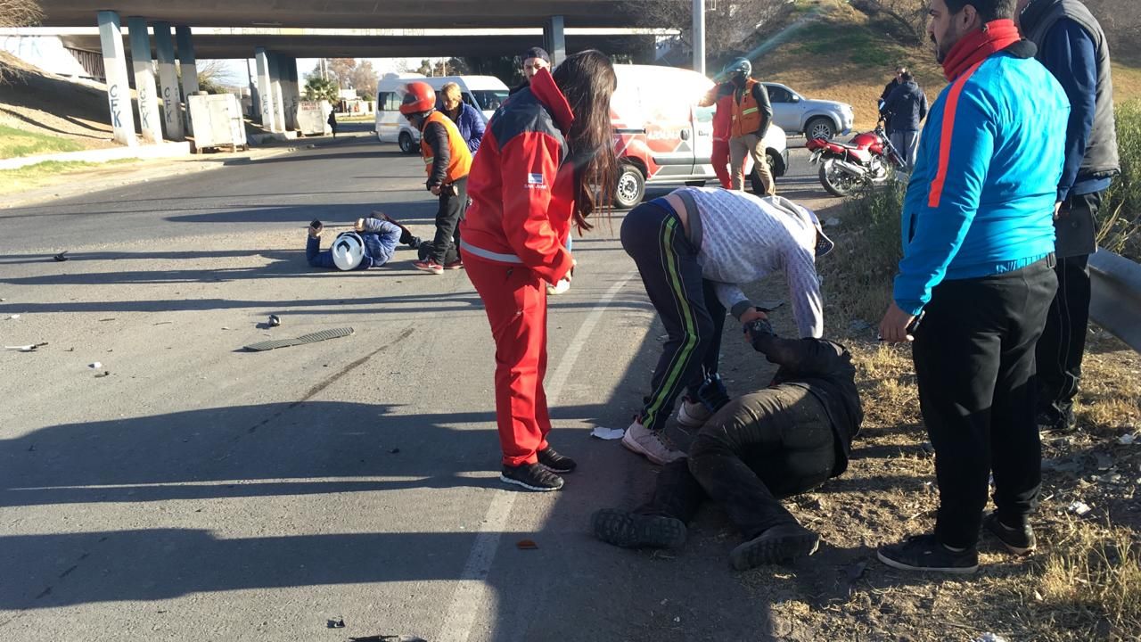 Uno de ellos terminó estrellándose contra el parabrisas del vehículo (se observa hundido) y luego cayó al pavimento, suerte que también corrió el otro ocupante del rodado menor. Por fortuna, los dos llevaban el casco puesto y ello evitó lesiones visibles en la cabeza, a la espera de la pesquisa médica.