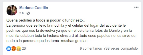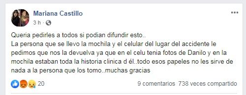 "Quería pedirles a todos si podían difundir esto. La persona que se llevó la mochila y el celular del lugar del accidente le pedimos que nos la devuelva ya que en el celu tenía fotos de Danilo y en la mochila estaban toda la historia clínica de él. Todo esos papeles no les sirve de nada a la persona que los tomó. Muchas gracias", destacó un pariente del menor.