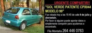 Se trata de un Gol modelo ’99 patente CPX 044. La mujer, pide que si alguien tiene información sobre el vehículo se comunique al teléfono 264-4460783.