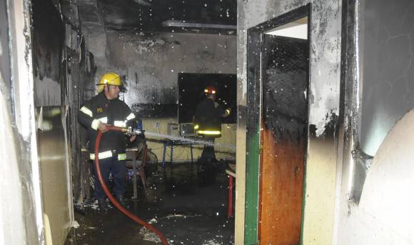 A las 13,22 dos dotaciones del cuartel central de bomberos llegaron a combatir las llamas, que ya habían arrasado con el depósito y con parte del aula de informática. Todo indicaba ayer que el incendio se originó por una falla eléctrica en la heladera, pero de todos modos bomberos iniciaron una investigación para determinar con precisión que pudo originar las llamas.