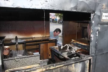 Un olvido, costó la pérdida completa de un carro de comidas (foto). Sucedió que dejaron prendida una hornalla de la cocina y ardió por varias horas hasta que ayer al mediodía desató un incendio que destruyó por completo la casilla rodante. La combustión fue lenta e imperceptible toda la noche, pero cerca de las 13 de ayer tomó fuerza. Esto pasó sobre el costado Este de calle Urquiza, a metros de Ignacio de la Roza, frente a la Facultad de Ingeniería, Capital. El fuego alcanzó una freidora, una plancha, una cocina panchera, un estante, un freezer, sillas y otros artefactos. Una dotación de Bomberos, a cargo del oficial Gastón Alcayaga, consiguió apagar las llamas. Néstor Cerdera, el dueño, aseguró que los daños fueron totales, por un costo de 15.000 pesos, dijo la Policía.