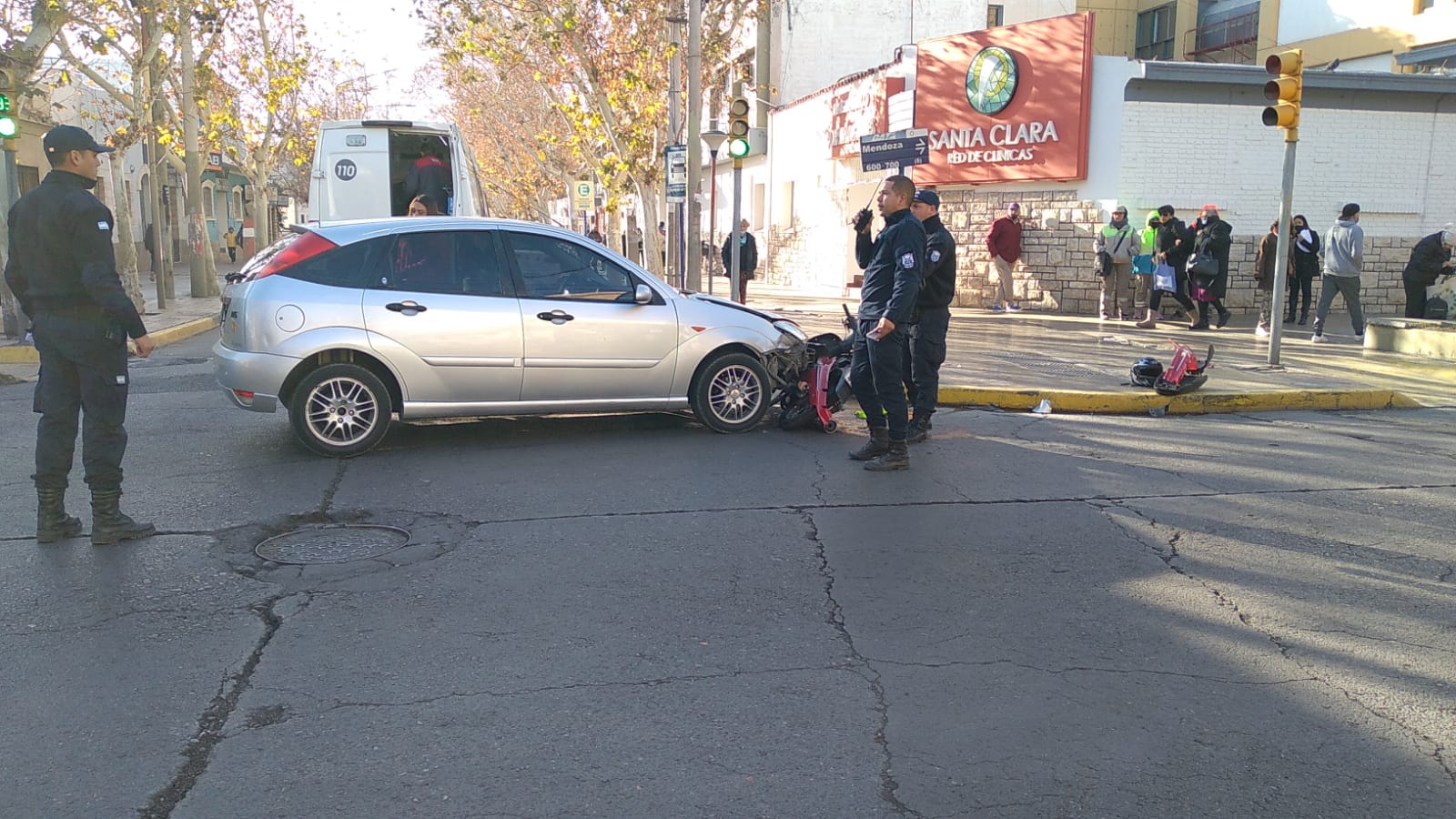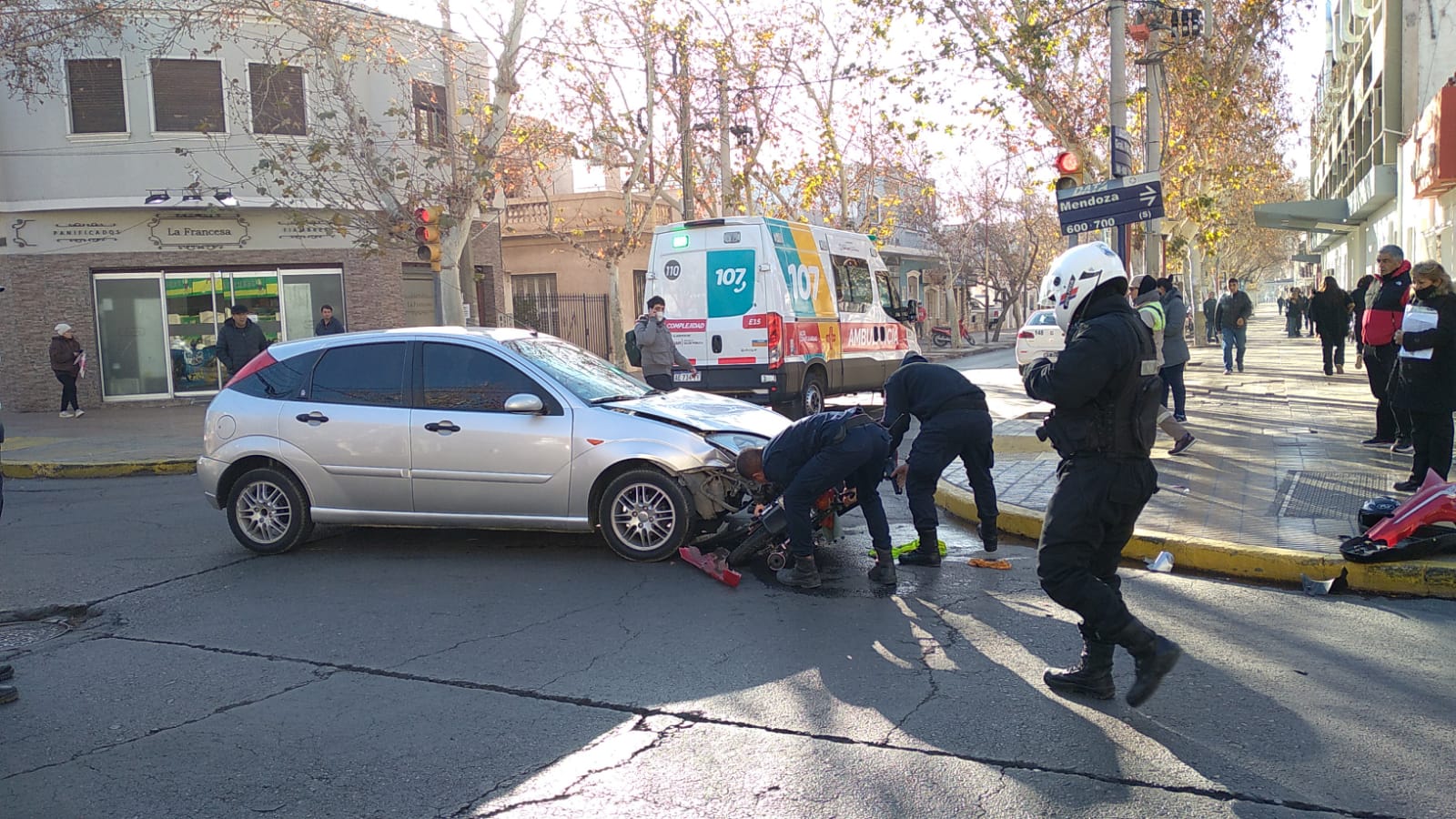 De acuerdo a algunos testigos, la moto 110 cc conducida por un hombre mayor de edad , que quedó debajo del Ford Focus que circulaba por calle Mendoza hacia el Sur, pasó en rojo y por ello la automovilista no pudo evitar el impacto.