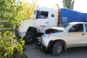 Fuentes de la comisaría Sexta dijeron que el camión era conducido por Jorge Daniel Ríos (24 años, riojano) y viajaba al Norte por Mendoza. Su destino era la báscula de la empacadora de ajo situada en ese lugar y ahi se disponía a entrar, pero cuando dobló fue chocado por la camioneta guiada por Gustavo Dacuña (26), que venía en el mismo sentido unos metros más atrás. Tras el choque ambos vehículos terminaron sobre la vereda Oeste de Mendoza, semidestruidos. "Es la primera vez que me pasa desde los cuatro meses que manejo el camión. Menos mal que no pasó nada grave", dijo ayer el camionero.