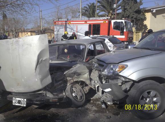 La imprudencia de un joven causó ayer un choque múltiple en Capital, que dejó como saldo una mujer peleando por su vida en la Terapia Intensiva de una clínica privada. Según la Policía, el muchacho conducía en estado de ebriedad y, al llegar al cruce de una avenida, pasó como venía e impactó contra el costado de una camioneta donde viajaba la víctima y su marido. Esa camioneta se cruzó de carril y colisionó contra un auto en el que circulaba un hombre y su hijo de 7 años. Tras el accidente, un vecino apagó con un matafuegos el motor en llamas del destrozado rodado del joven y la mujer que viajaba en la camioneta fue trasladada en grave estado al Hospital Rawson.