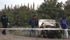 Al extremo hecho de violencia que sufrió el viernes Laura, se sumó la aparición del cuerpo de Molina totalmente calcinado dentro de su Fiat Duna en un descampado de calle Independencia, 1,5 km al Norte de Laprida, en Boca del Tigre, San Martín. Fuentes policiales indicaron que el hombre se habría matado a lo bonzo, ya que no hallaron ningún arma en la escena.