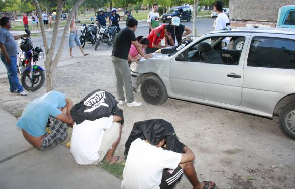 Un sujeto, que estaba con dos amigos (foto), preso por tener 20 porros en el Bº Mercedario. Y otro de 25 años, detenido con 100 g de cocaína en Villa El Salvador, fue el saldo de dos operativos distintos realizados ayer por policías de Drogas Ilegales en Chimbas, informó la Policía.