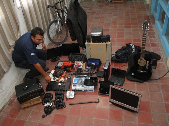 Los policías de la Seccional 27ma, con apoyo de la Brigada Norte, allanaron ayer cinco domicilios en los barrios ATE-API y Huazihual en Rivadavia donde secuestraron objetos que serían robados. Entre esas cosas encontraron 2 monitores y unos parlantes que habrían sustraído de una escuela, también otros artefactos electrónicos y hasta una guitarra que falta determinar su procedencia.