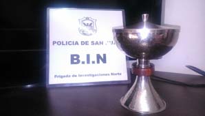 San Juan, 12 de octubre.- En un allanamiento, la Policía encontró una serie de elementos robados entre los cuales había un cáliz. Sospechan que es el que se llevaron junto a las hostias consagradas de la parroquia Sagrada Familia de Nazaret, de Zonda, el 28 de agosto pasado. Hecho que generó conmoción y polémica entre los fieles.