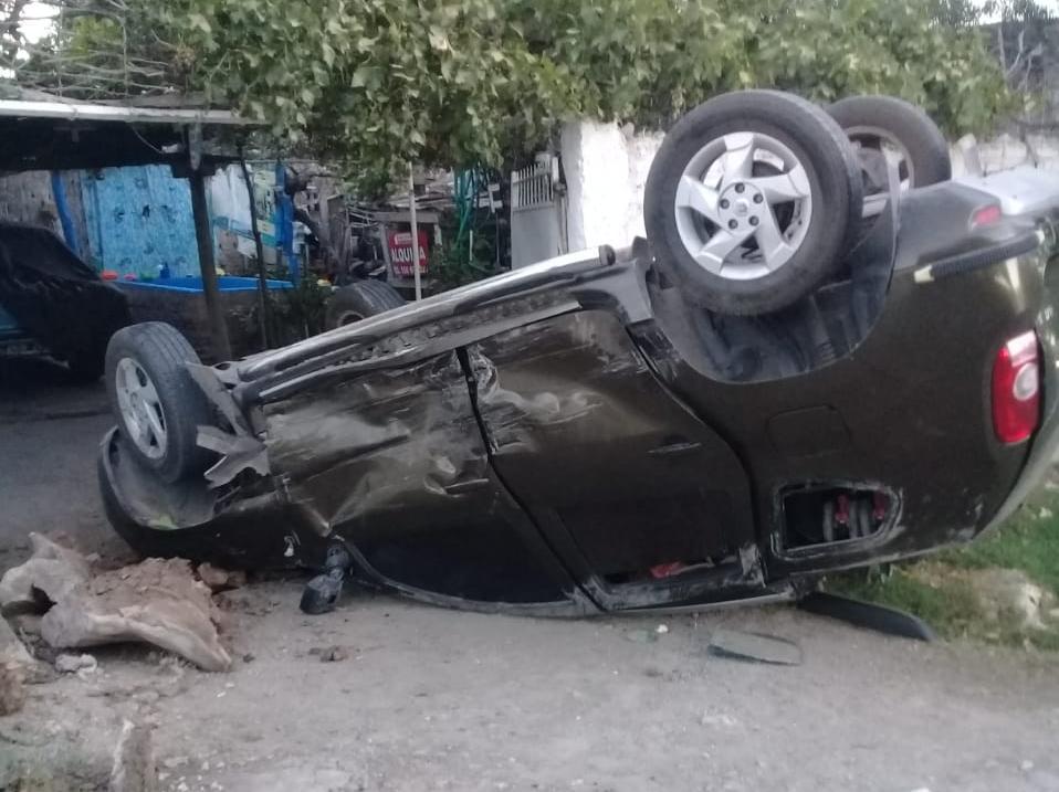 Un espectacular accidente se produjo alrededor de las 19:30 de este jueves en el interior de la Villa Rodríguez Pinto, en el departamento Rivadavia. Chocaron dos vehículos y uno de ellos terminó volcado, acabando su raid en el portón de una vivienda, sin ocasionar daños a los moradores.