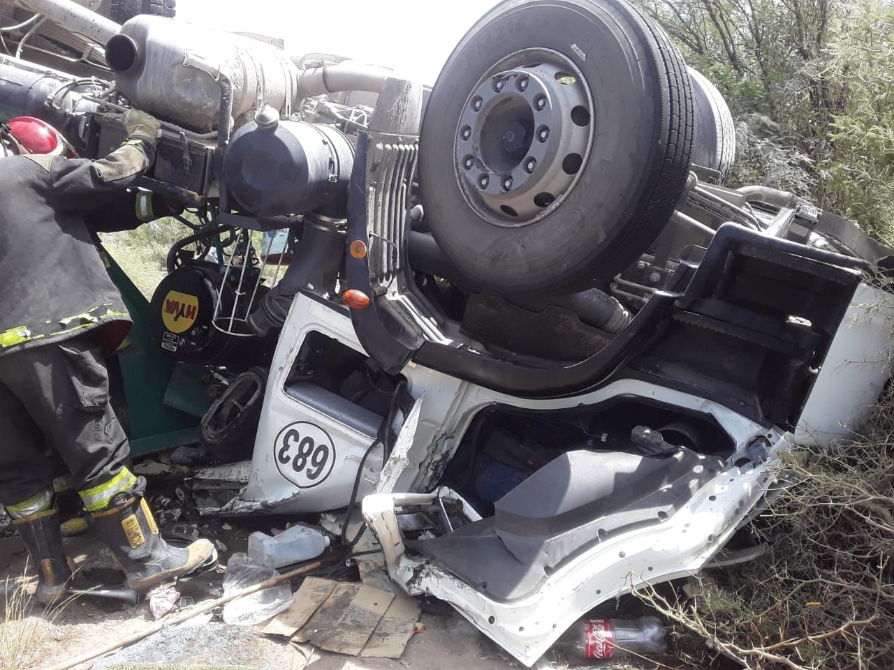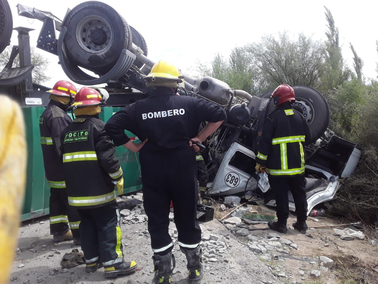 Castro intentó esquivarlos, pero la maniobra le salió mal y el vehículo de gran porte se fue contra la banquina y él terminó atrapado en la cabina, mientras que la carga quedó desparramada sobre el asfalto.