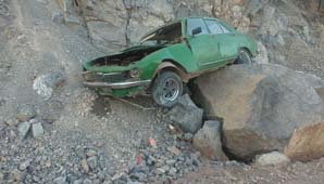 San Juan, 21 de septiembre.- Impresionante. Así es la imagen de cómo quedó, sobre una enorme roca y en plena montaña, un auto después que su conductor se quedara dormido.