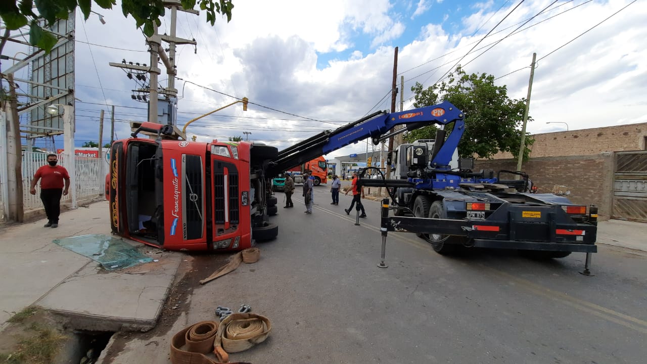 En una primera instancia, el camión se dirigía hoy jueves por la tarde por calle España de norte a sur y cuando el conductor intentó girar en calle Cabot, hacia el este, la velocidad y el radio de giro se complotaron para que el vehículo perdiera la estabilidad y finalmente terminara volcando.