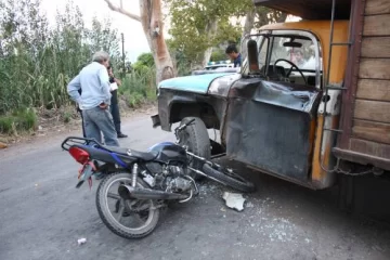 Ocurrió a las 19.20 de ayer cuando Manuel Fernández (65) salía en una Dodge 100 con tomates del callejón Riveros a calle 11, en Pocito, y dos jóvenes que transitaban al Oeste por 11 en una Zanella 150cc., se incrustaron en la parte delantera de la camioneta. Pese al impresionante impacto, según la policía, José Buenanueva (30) y Leonardo Nuñez (20) no sufrieron heridas graves.
