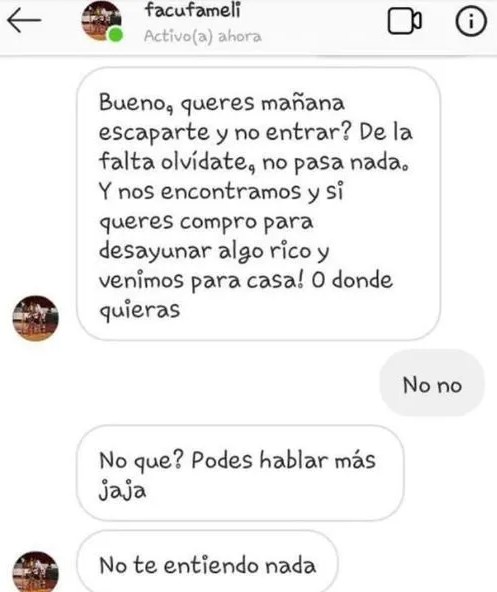 En uno de los chats que se le adjudican a Fameli, el preceptor invita a la alumna a faltar al colegio para mantener un encuentro íntimo: "¿Querés escaparte mañana y no entrar? De la falta olvidate, no pasa nada. Y nos encontramos, y si querés compro para desayunar algo rico y venimos para casa, o dónde quieras".