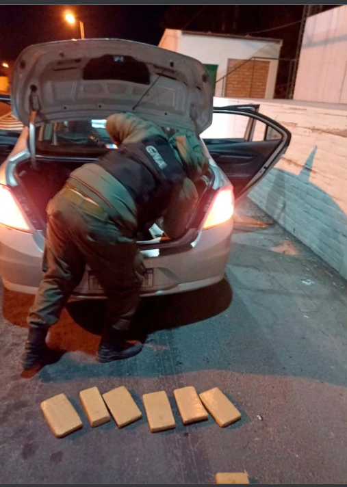 A los minutos se aproximó otro vehículo conducido por un familiar del primer ciudadano involucrado. Ante los indicios previos, se requisó el sector del baúl y se halló entre la chapa y la alfombra, ocho paquetes envueltos en cinta color ocre conteniendo una sustancia vegetal y dos envoltorios uno de ellos con cocaína.