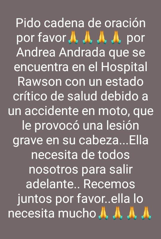 Finalmente, amigos y familiares de Andrea piden cadena de oración por ella, debido a que presenta importantes daños neurológicos.