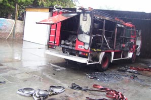 Mangueras, equipos de escalamiento, escaleras, persianas, cascos, sacos derretidos y severos daños en la parte trasera y derecha del camión hidrante. Esa fue la destrucción que dejó un incendio en el flamante camión del cuartel de bomberos de Jáchal. El vehículo quedó estacionado en un pequeño tinglado de la playa de estacionamiento del municipio norteño y, al parecer, las intensas lluvias del sábado habrían provocado un cortocircuito en el sector de la unidad que alimenta las luces de exposición, originando el dañino incendio, dijeron fuentes policiales.