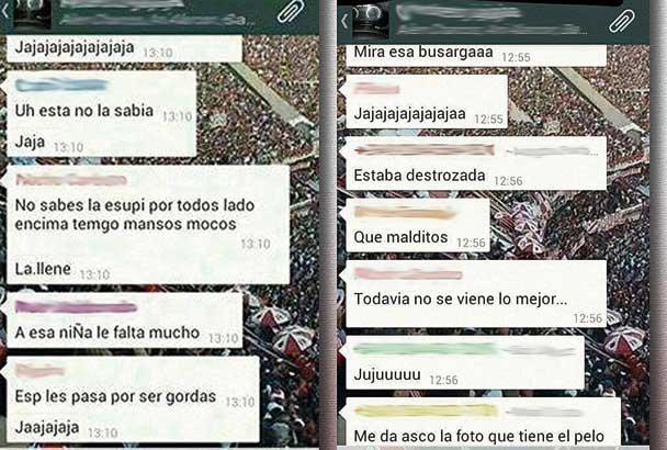Uno de los supuestos victimarios escribió: ‘No sabés, la escupí por todos lados’. Otro señaló: ‘eso les pasa por ser gordas’. Y así muchos otros comentarios, pero a medida que las imágenes y esas frases comenzaron a circular por Facebook también estalló la bronca y el rechazo de los lectores. La respuesta fue la denuncia pública en la web y el escrache contra los presuntos autores.