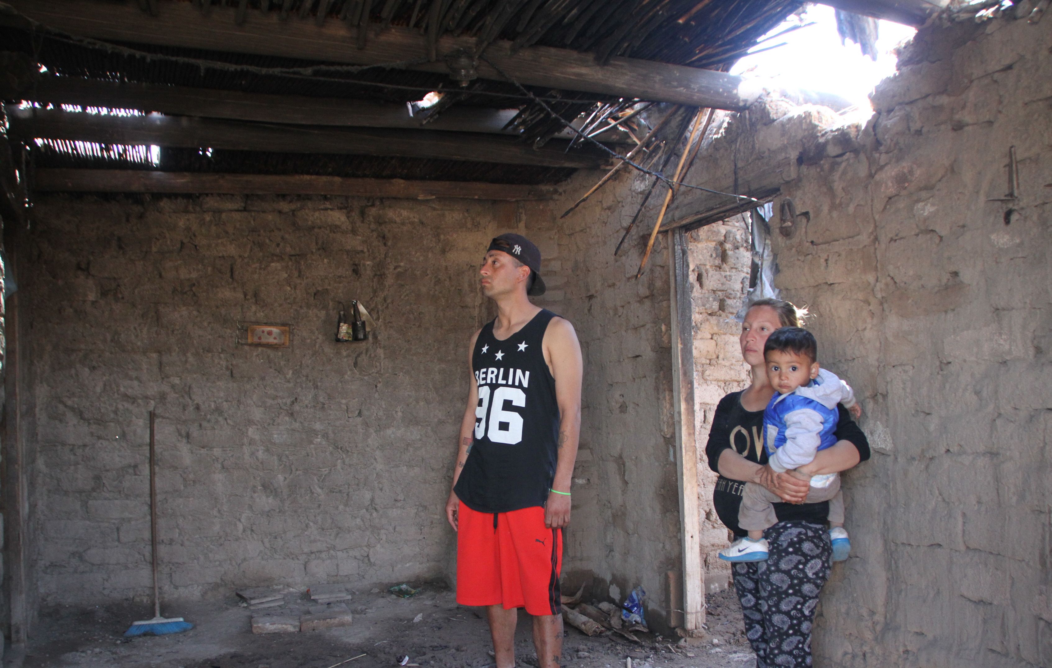 Inhabitable. Matías Olmedo junto con una pariente muestran cómo quedó destruida su vivienda después del siniestro.