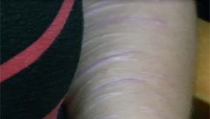 San Juan, 5 de diciembre.- Los tres imputados y ahora condenados por el crimen de Cristina Olivares no tuvieron durante el juicio gestos en sus rostros que marquen algún estado de ánimo en particular, pero sí llamó la atención cómo en cada jornada del juicio Rosa Videla exhibió sus brazos tajeados, aparentemente producto de una autoflagelación.