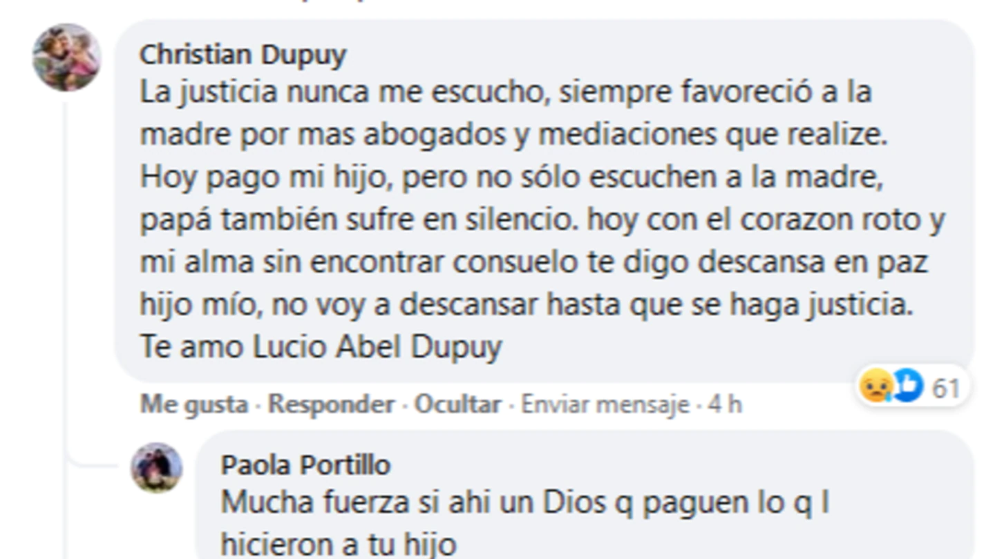Por último, en su publicación en la mencionada red social el joven que vive en General Pico afirmó: “Hoy con el corazón roto y mi alma sin encontrar consuelo te digo descansa en paz hijo mío, no voy a descansar hasta que se haga justicia. Te amo Lucio Abel Dupuy”.