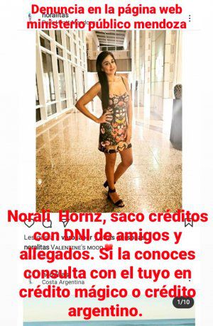 “No me gusta tener que hacer esto, pero no se puede tapar más y nos ha afectado a muchas personas. Norali Hornz, de San Martin, una compañera nuestra de trabajo pedía una copia del DNI, para una encuesta de la facultad, y sacó préstamos a nuestros nombres, por montos exorbitantes”, cuenta Silvina López en de Facebook.