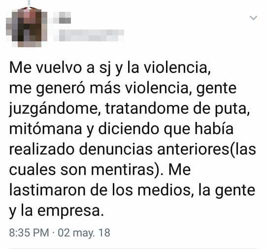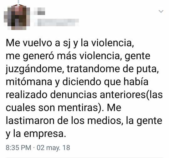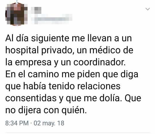 En una serie de sucesivos tuits, la joven aseguró que desde la empresa le pidieron no contar a los médicos lo sucedido y menos con quien. También afirmó que la justicia de Bariloche desoyó las pruebas y tomó testimonio de personas que no habían sido parte de aquel viaje.