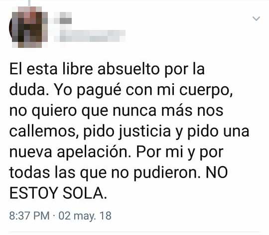 "El está libre, absuelto por la duda. Yo pagué con mi cuerpo, no quiero que nunca más nos callemos, pido justicia y pido una nueva apelación. Por mi y por todas las que no pudieron. NO ESTOY SOLA", escribió.