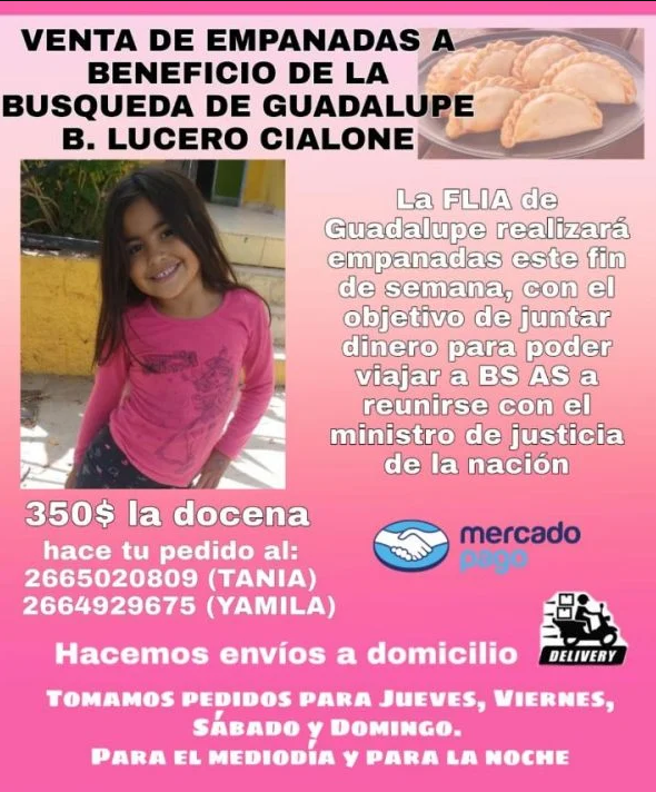 Yamila Cialone, la mamá de Guadalupe Belén Lucero, la nena de 5 años que lleva 2 meses desaparecida en San Luis, decidió organizar una venta de empanadas para juntar dinero. El fin: viajar a Buenos Aires para mantener una reunión con el ministro de Justicia de la Nación Martín Soria, el próximo jueves 26 de agosto.