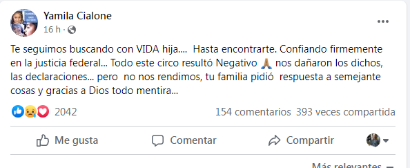 Y enfatizó: “Seguimos confiando firmemente en la Justicia Federal y gracias a Dios todo lo declarado por una persona que decía haber matado a mi hija fue falso".