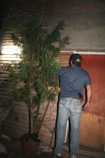 Policías federales realizaban anoche, al cierre de esta edición un operativo en el barrio 2 de Agosto (calle Cabañas, al Norte de Libertador, Rivadavia) que arrojaba como saldo el secuestro de tres plantas de marihuana, incluida -dijeron- la mayor secuestrada hasta el momento en San Juan, de al menos 2,5 metros (foto). También hallaron plantines, semillas y hojas de la hierba. Había por lo menos dos detenidos.