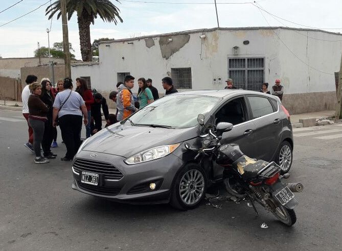 Un motociclista terminó con lesiones de distinta consideración luego de protagonizar con un automovilista un choque impresionante en Rawson, al punto de que la moto, una Zanella 125cc que un joven no identificado guiaba al Oeste por Calle 5, terminó ensartada en el Ford Fiesta Kinetic cuyo conductor conducía al Sur por Godoy. Ocurrió cerca de las 14 de ayer. Según la Policía, el motociclista quedó a salvo.