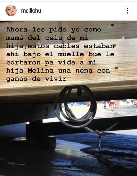 "Ahora les pido yo como mamá del celu de mi hija, estos cables estaban ahí bajo el muelle bue le cortaron la vida a mi hija Melina, una nena con ganas de vivir", dice el posteo que acompaña con una foto.