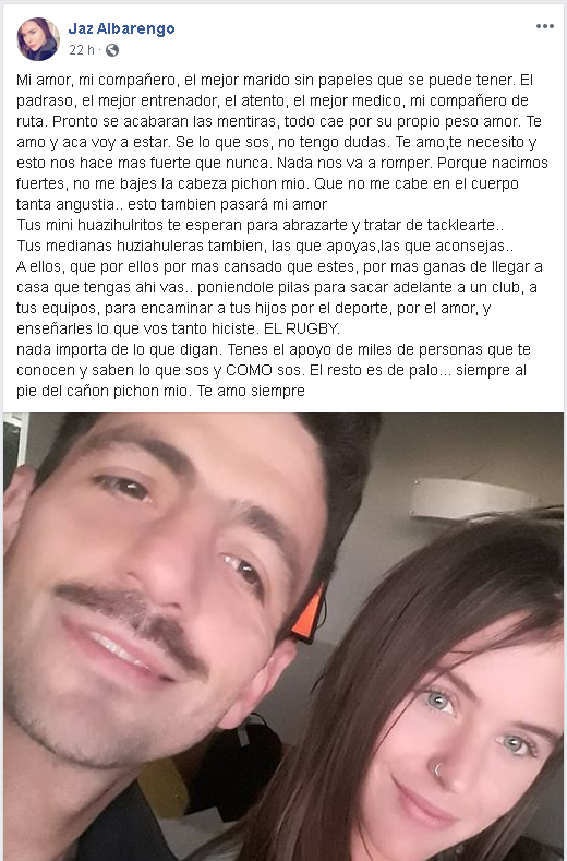Albarengo sostiene "que no me cabe en el cuerpo tanta angustia… esto también pasará, mi amor". Con palabras de aliento, la joven destaca que las categorías de Huazihul lo "esperan" para abrazarlo y "tratar de tacklearte".