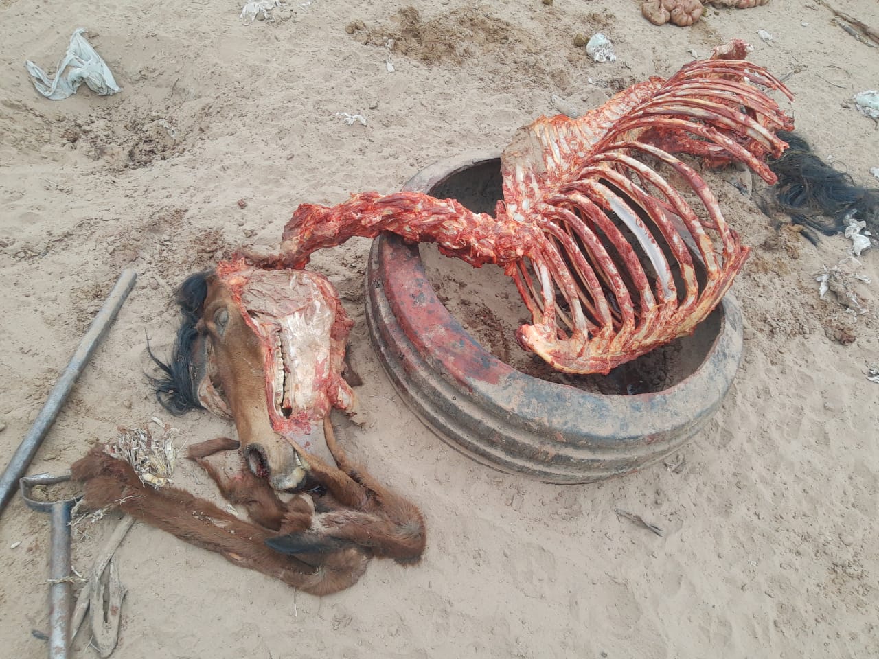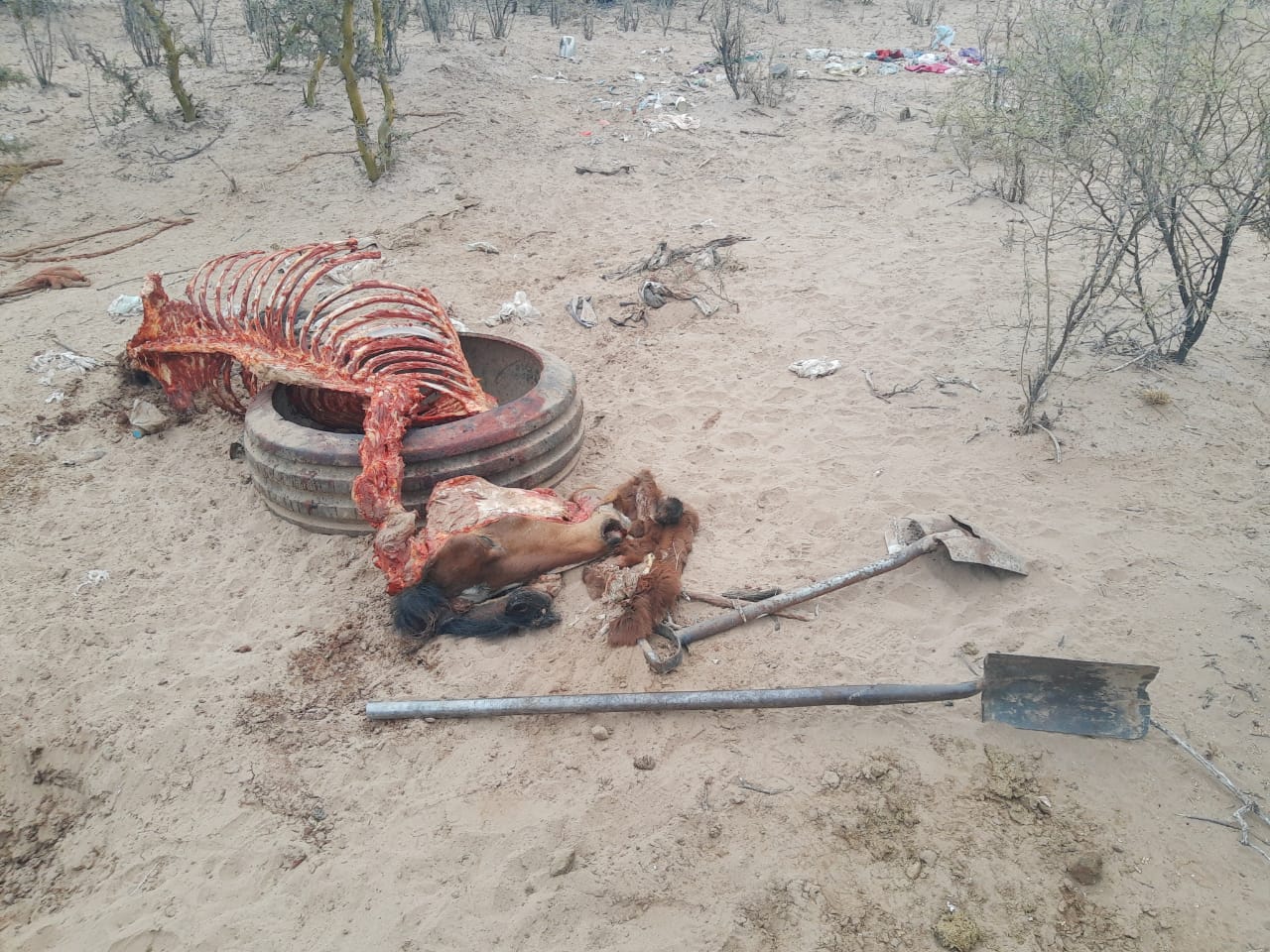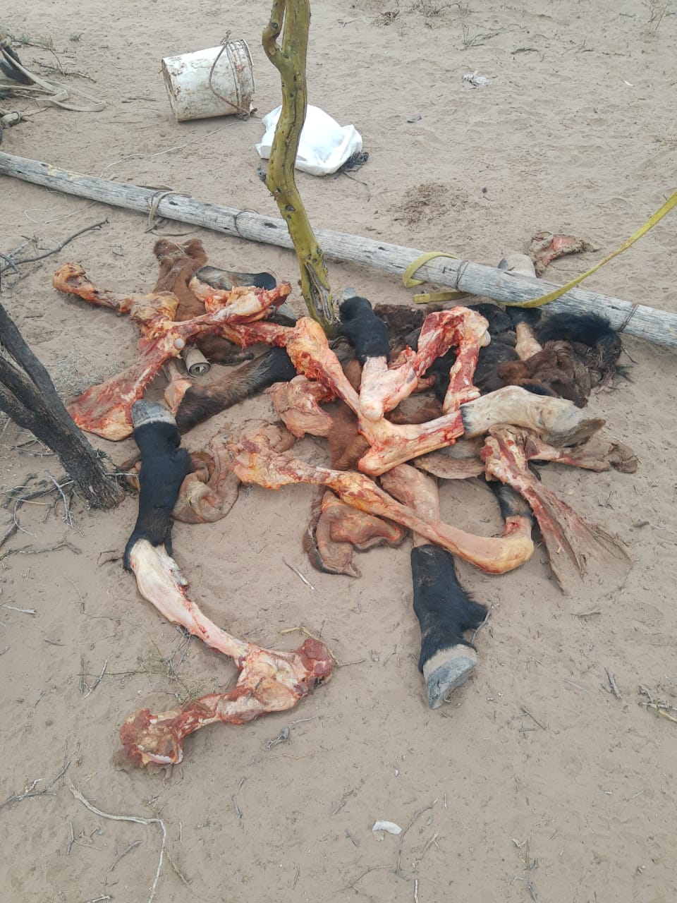 En las fotos se pueden observar huesos, pezuñas y cabezas de estos animales que fueron faenados y quedaron desparramados sobre el terreno.