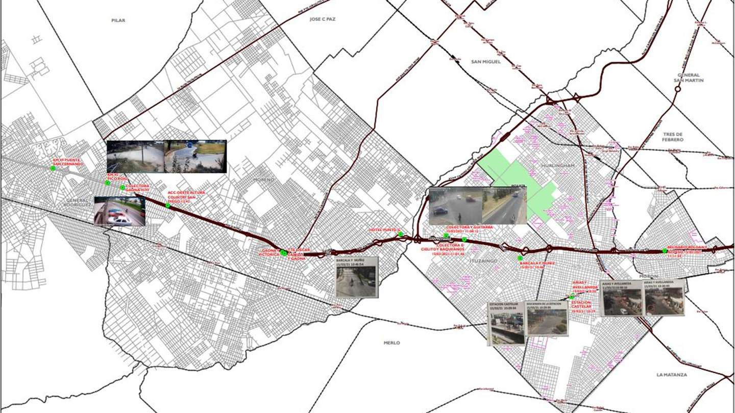 El rastro reapareció a las 12.42 cuando las cámaras los volvieron a captar en el Acceso Oeste, a la altura del Country San Diego. Más tarde pasaron por la Colectora/Gaona 9599 y luego por el kilómetro 45, en el barrio Pico Rojo.