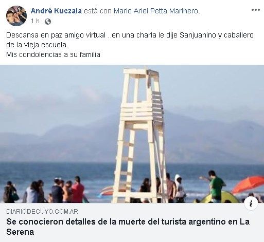 Durante la tarde de ayer, un sanjuanino murió tras ahogarse cuando se bañaba en el mar de La Serena. La víctima fue identificada como Mario Ariel Petta Marinero, de 49 años de edad. Fanático del paintball y padre de familia, sus amigos lo despidieron en las redes sociales con mensajes conmovedores, llenos de dolor.