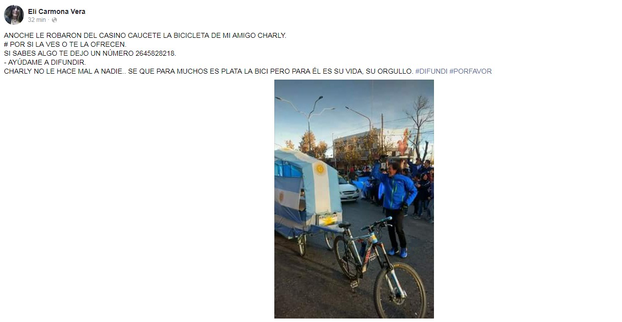 En la noche del viernes, Charly, un conocido personaje de Caucete, dejó su bicicleta deportiva atada con alambre frente al casino y entró al lugar. Al salir, su movilidad ya no estaba. Ahora, sus vecinos piden ayuda en las redes para recuperarla.