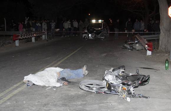 La escena del siniestro sugería una múltiple tragedia porque dos de las motos (ambas Honda 125cc.) terminaron incrustadas bajo el guardarraíl de un puente, y otra más, una Motomel 125cc. dentro de un zanjón unos metros más al Norte de donde quedó tendida la víctima.