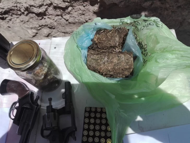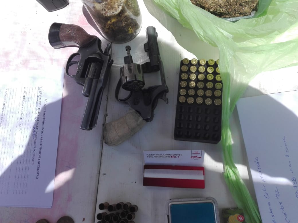 Al ingresar al lugar, encontraron en una de las habitaciones tres armas de fuego tipo revólver calibre 22, una con 4 proyectiles en su interior, más ocho proyectiles sueltos del calibre de las armas halladas, además de 30 vainas servidas de calibre 22, dentro de una media.