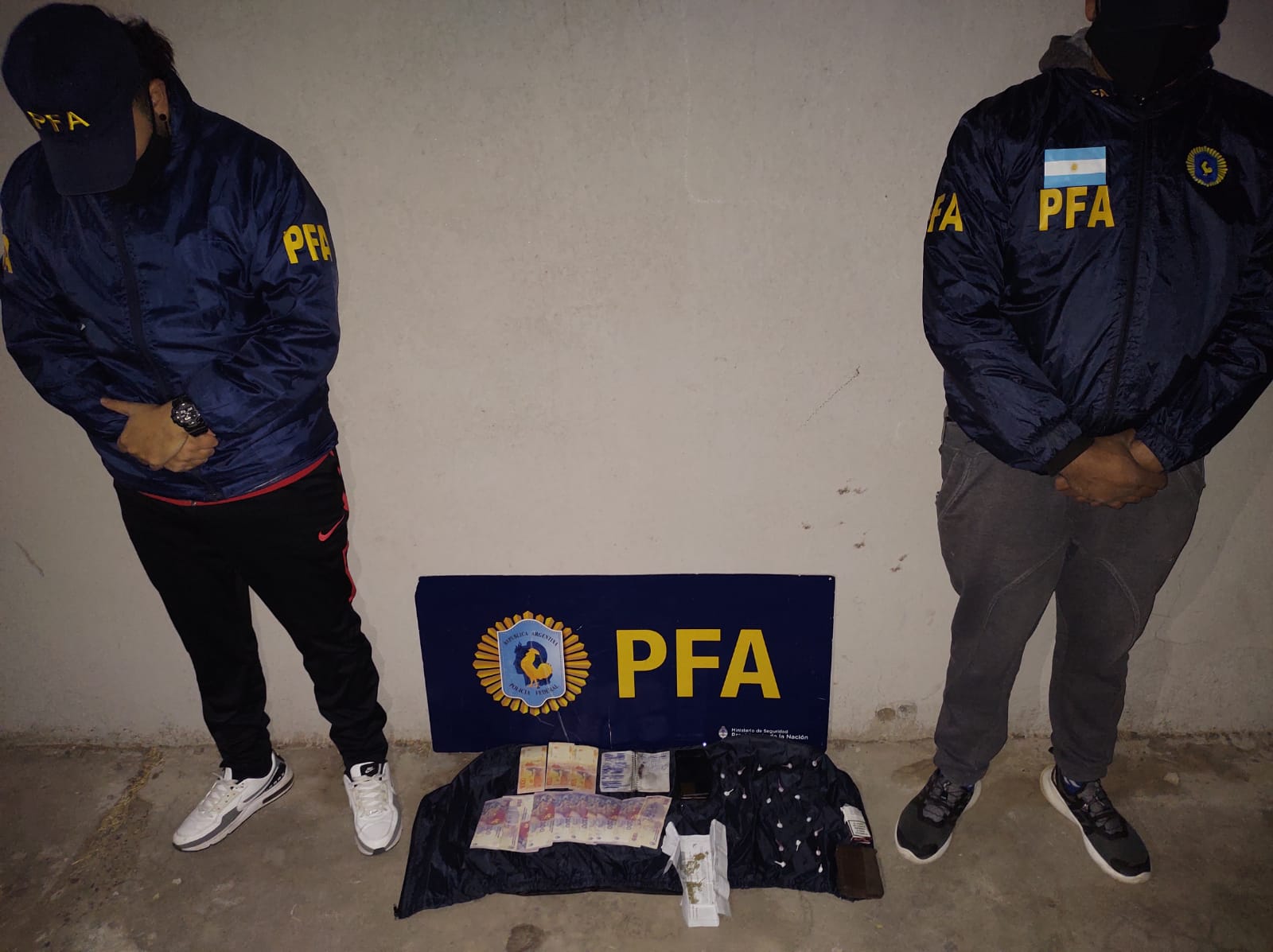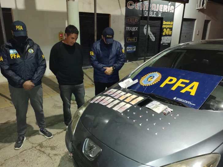 En ese contexto, el personal realizó un control y encontró en la gavera del auto 21 envoltorios de nylon con una sustancia de color blanca similar al clorhidrato de cocaína, junto a un sobre de papel conteniendo en su interior un trozo de materia vegetal verde similar a marihuana billetes de diferentes denominación y un celular.