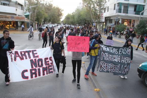 Allí, sus amigos y familiares hicieron un fuerte pedido de justicia con banderas con textos como “Arte no es crimen”, “Justicia por Ezequiel” y “Mientras exista miseria habrá rebelión”. También cantaron “Furia presente, ahora y siempre”, manifestando un fuerte apoyo para Ezequiel Flores Oviedo, quien con 19 años perdió la vida.
